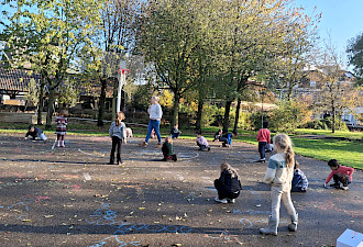 Het is lekker weer en groep 3 rekent buiten met contextsommen.
