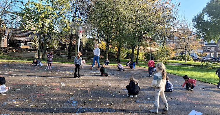 In alle klassen leren de kinderen omgaan met contextsommen. De juf vertelt een verhaal: ik heb 8 ballen in totaal. Daarvan zijn er 4 een tennisbal, hoeveel voetballen heb ik? De leerlingen schrijven met stoepkrijt de bijbehorende som op de grond. Ze hoeven niet het antwoord te geven, maar leren zo het verschil tussen een splitssom, een minsom en een plussom.